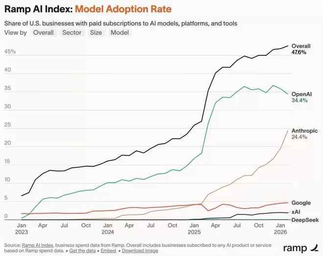 Ramp经济学家AraKharazian指出,一年前只有二十五分之一的企业为Anthropic付费,现在这个比例是四分之一。
