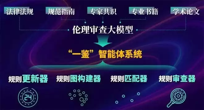 进入“ai for science”时代,人工智能等前沿科技能否反哺伦理治理,从而促成“科技与伦理治理”的携手共进,已然成为值得探索的新议题。2024年起,王国豫带领学生与姜育刚、马兴军和生命科学学院杨亚军团队合作,着手开展伦理审查大模型的训练。经过近2年的努力,“一鉴”大模型应运而生。基于高质量伦理审查数据微调的专用大模型,“一鉴”集成了规则更新器、规则图构建器、规则匹配器和规则审查器四大核心模块,能够定期自动抓取、提炼最新政策法规,构建分层分领域的伦理规则知识图谱,并针对待审查的项目资料高效精准匹配相关规则。