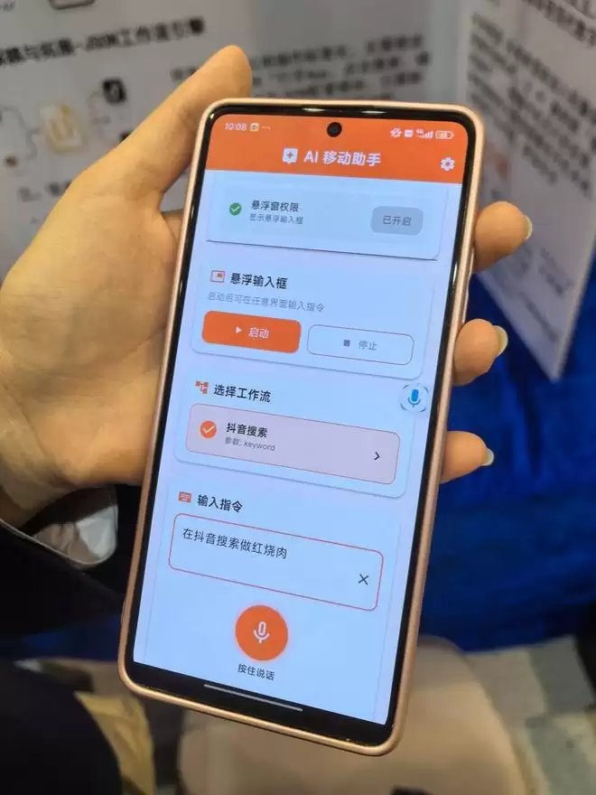“这是我开发的AI移动助手APP。”小詹向记者展示了她的创新成果。打开这个APP,选择“抖音搜索”工作流,再按住话筒图标说一句话:“在抖音搜索做红烧肉。”此时,手机界面就跳转到了抖音,显示出搜索词为红烧肉的一系列视频。如果选择“微信发送消息”工作流,再按住话筒图标说“给孙女发微信说我到家了”,手机界面就会跳转到微信,并给微信名为“孙女”的用户发送消息:“我到家了。”
