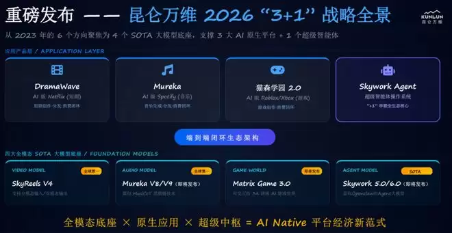 针对此,发布会现场,周亚辉正式宣布,昆仑万维2026年AGI战略升级为“3+1”生态架构——以4个SOTA大模型为底座,支撑3大AI原生平台+1个超级智能体。