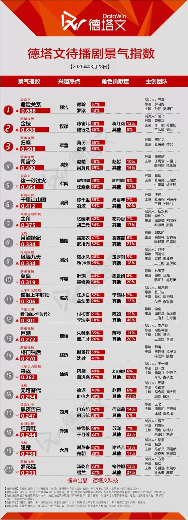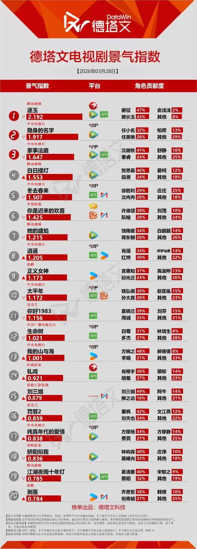 德塔文电视剧景气日报2026-03-28电视剧当日景气TOP20TOP20排名逐玉(谢征47% 樊长玉43%) 隐身的名字(任小名32% 任美艳26%) 家事法庭(沈谢秩41% 秦睿2