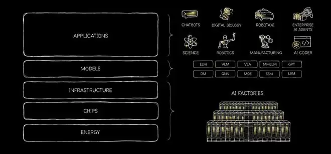 过去两年,围绕生成式AI的讨论大多集中在模型能力和算力规模,但最近黄仁勋发文,给出了一个更系统的框架——AI是一块“五层蛋糕”(AI is a five-layer cake):从底部的能源,到芯片、AI基础设施,再到模型与应用,层层叠加,构成一整套新的工业体系。