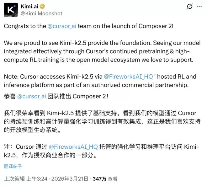 这份积累,最近又在Agent热潮里再次显露。就在几天前,估值即将冲击500亿美元的AI编程独角兽Cursor高调发布Composer2模型,随后被全球开发者发现,其底层基座是月之暗面早前开源的Kimi K2.5。之后最新证实,这是一笔基于Fireworks AI的授权商业合作。