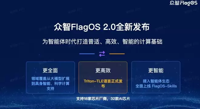 众智FlagOS是智源研究院联合国内外多家高校、芯片厂商和科研机构共同打造的面向多种AI芯片的开源统一系统软件栈,被誉为“人工智能大模型的操作系统”。