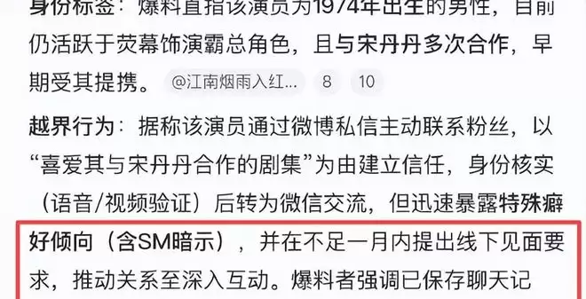 据悉,一位1974年出生、常年演霸道总裁还和宋丹丹多次合作的男演员,被指主动私恋粉丝。