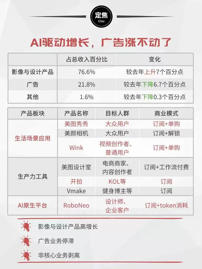 当前产品体系主要分为三类:一是以美图秀秀、美颜相机、Wink为代表的生活场景应用;二是以美图设计室、开拍、Vmake为代表的生产力工具;三是AI原生平台RoboNeo。
