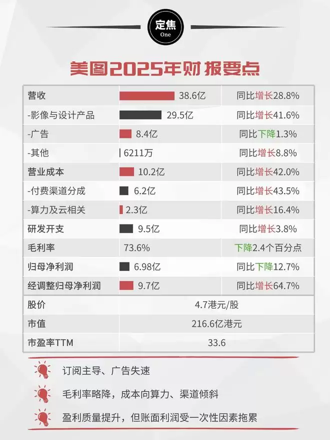 全年实现总收入38.6亿元,同比增长28.8%,核心业务影像与设计产品收入达29.5亿元,同比增幅41.6%,占总收入比重提升至76.6%;广告业务收入为8.4亿元,同比微降1.3%;其他业务收入6211万元,同比增长8.8%。