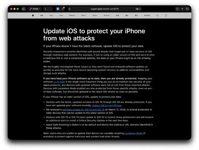 苹果在提醒中明确表示,已发现针对过时 iOS 版本的攻击,而用户当前设备正处于风险范围内,因此建议尽快更新系统以保护你的 iPhone。