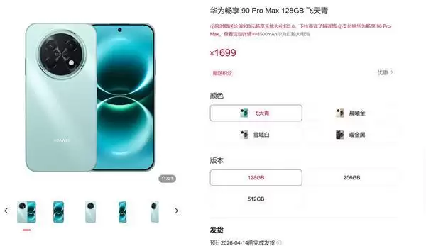 快科技3月28日消息,华为商城显示,华为畅享90 Pro Max将于4月2日正式开启销售。该机型的起售价定为1699元,并提供飞天青、曜金黑、晨曦金以及雪域白四种极具质感的配色方案供消费者选择。