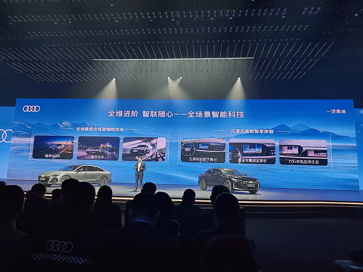 智能科技领域,华为乾崑智驾系统与奥迪VMM车辆运动管理模块深度协同,配合双激光雷达实现城区/高速NOA、跨层记忆泊车等高阶功能。多屏交互系统由14.5英寸MMI全景显示屏、11.9英寸虚拟座舱、13.1英寸W-HUD与10.9英寸副驾屏组成,智能语音助手覆盖车窗、空调等全场景控制,支持连续对话与方言识别。此次共推出4款燃油车型(售价32.29-43.59万元)与4款电动预售车型(预售价31.3-44.3万元),形成覆盖传统动力与新能源的完整产品矩阵。