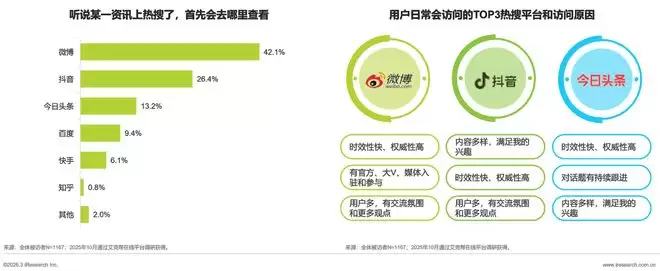 数据能最直观地说明这种差异。艾瑞咨询数据显示,当听说某资讯上了热搜,42.1% 的用户会第一时间去微博查看,与第二名拉开了近两倍的差距。虽然用户体量有差距,但在热搜心智上,微博在中国互联网领域可能还没有对手。