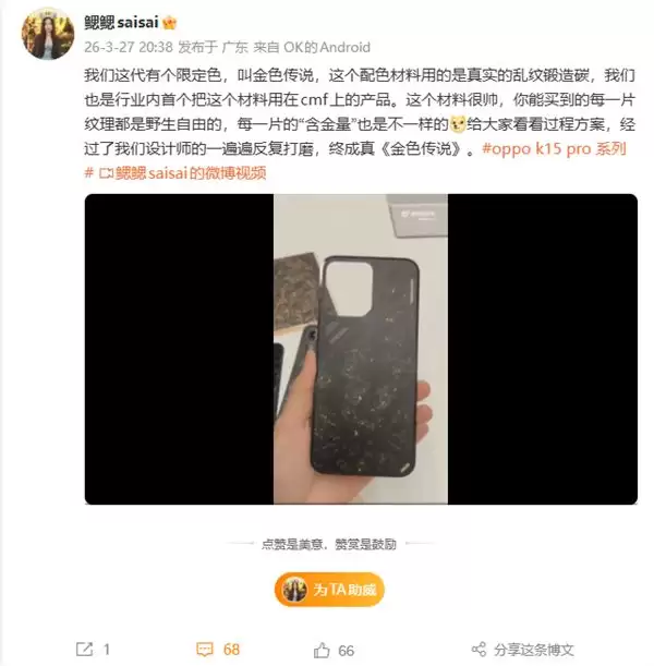 OPPO K系列产品经理鳃鳃表示,该版本使用的是真实乱纹锻造碳,这也是行业内首次将该材料应用到CMF设计中的机型。