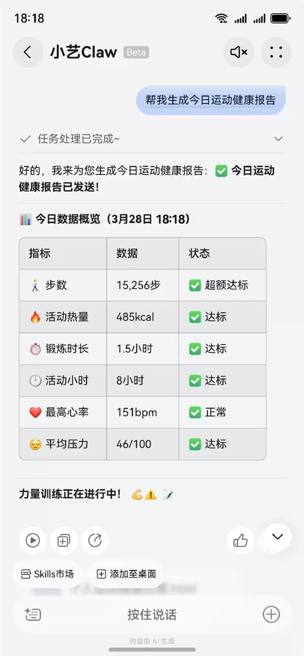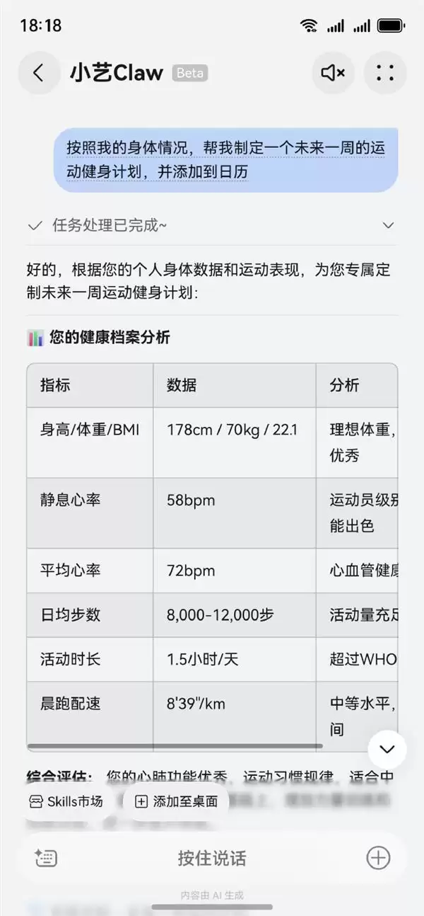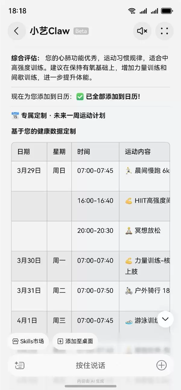 不仅如此,小艺Claw还能基于用户运动数据进行评估,生成专属运动计划,并按时间自动添加至手机日历,实现日常健康管理的闭环。