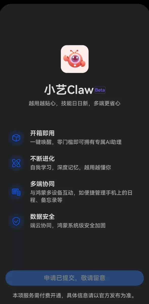 IT之家 3 月 25 日消息,华为鸿蒙手机的“龙虾”—— 小艺 Claw 目前已开启预约,适配 HarmonyOS 6 系统,支持手机、平板设备。用户可在小艺 App 内输入“小艺 Claw 预约