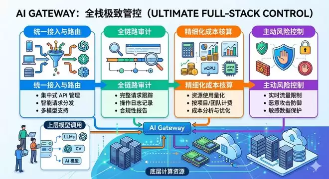 AI Gateway 提供受控模型访问、审计追踪、成本分析和风险控制