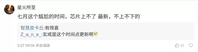 后续有用户在评论区表示:“七月这个尴尬的时间,芯片上不了最新,不上不下的”,博主回复道:“有惊喜”;另一名用户则表示:“先把上下分屏搞定吧”,博主则回复道:“有惊喜”。