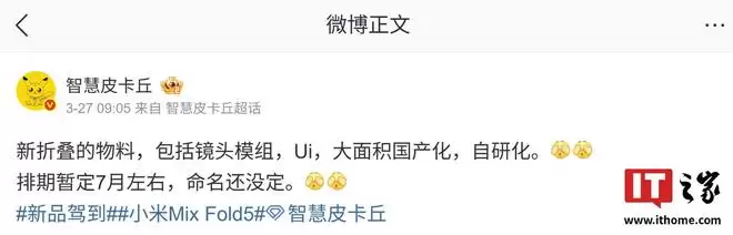 IT之家 3 月 29 日消息,博主 @智慧皮卡丘 前天在微博透露,某厂的全新折叠屏手机在物料、镜头模组、UI 等方面实现大面积国产化、自研化。博主表示,该机排期暂定 7 月左右,命名还没定。后续有