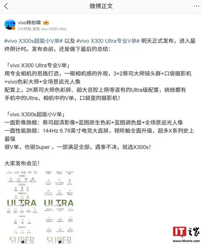 IT之家 3 月 29 日消息,vivo X300s 以及 vivo X300 Ultra 将在明天正式发布。vivo 通信科技有限公司产品经理韩伯啸今日发文对两款新机的配置进行了最后的总结:「vi