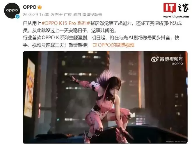 IT之家 3 月 29 日消息,OPPO 最新今日宣布,行业首款 OPPO K 系列主题漫剧,明日起将在与光 AI 剧场账号同步抖音、快手、视频号连载三天。自从用上 OPPO K15 Pro 系列我