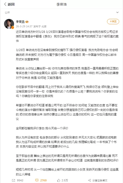 3月29日消息,3月28日,单依纯演唱会在深圳举行,其间她翻唱歌曲《李白》。对此,李荣浩微博发文喊话单依纯:称对方在李荣浩方婉拒翻唱授权的情况下,强行侵权演唱《李白》。李荣浩说单依纯在《歌手》中的翻