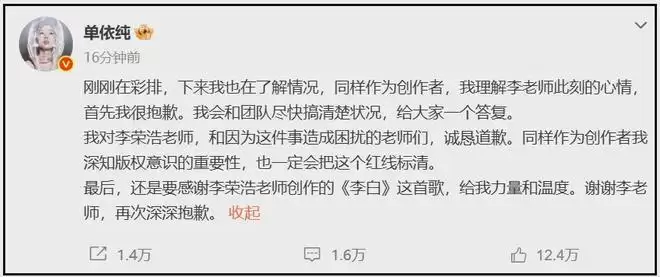 内娱又有明星正面开撕啦!41岁歌手李荣浩公开指责单依纯侵权,发了长文炮轰对方在没有拿到授权的情形下强行演唱了李荣浩原创歌曲《李白》,不愧是原创歌手,自己靠自己吃饭就是硬气。目前单依纯本人已经回应了,