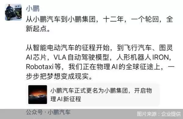 此番更名的背后,是小鹏汽车从整车企业向AI科技集团转型的野心。小鹏汽车董事长、CEO何小鹏在朋友圈写道:从小鹏汽车到小鹏集团,十二年,一个轮回,全新起点,"从智能电动汽车的征程开始,到飞行汽车、图灵AI芯片、VLA自动驾驶模型、人形机器人IRON、Robotaxi等,我们正在物理AI的全球征途上,把梦想变成现实"。