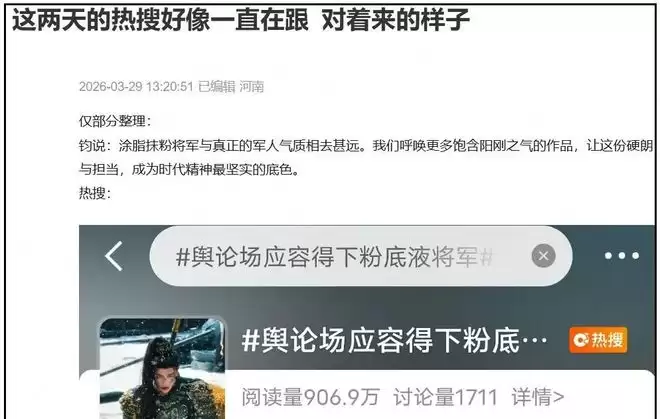 官媒刚点明态度,呼吁让硬朗和担当成为这类角色的核心精神,转头就冒出来一个“舆论场应容得下粉底液将军”的热搜,这不摆明了对着干吗。官媒接着发声强调,话语权不是粉底液涂出来的,文艺创作可以追求审美多元,但不能丢了真实,更不能消解正向的精神内核。结果人家转身又安排上一个热搜,说“观众反感的从来不是帅将军”,直接把网友的正常质疑,歪曲成嫉妒男主长得帅。