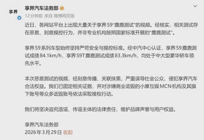 【享界法务发布“麋鹿测试”声明】3月29日,享界汽车法务部发文,全文如下:近日,各 平台上出现大量关于享界S9“麋鹿测试”的视频。经核实,相关测试存在恶意、刻意操控行为,并非专业机构按照国家标准开展的“麋鹿测试”。享界S9系列车型始终坚持严苛安全与操控标准。经中汽中心认证,享界S9麋鹿测试成绩84.1km/h,享界S9T麋鹿测试成绩83.3km/h,均处于中大型豪华轿车领先水平。本次恶意测试的视频,经刻意传播、关联抹黑,严重误导社会公众,侵犯享界汽车合法权益。我们已固定相关证据,并对涉嫌商业诋毁的小摩互娱MCN机构及其旗下账号等众多诋毁账号依法采取维权行动。我们将坚决追究造谣、传谣主体的法律责任,维护品牌声誉与用户权益。(红星新闻)