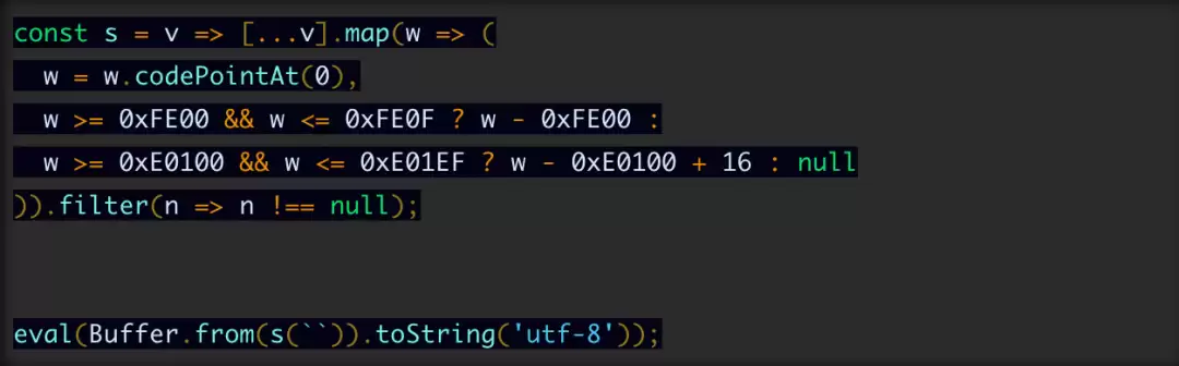 这是 Unicode 规范中专为定义表情符号、旗帜等符号而保留的特殊字符范围。攻击者利用其中与美式英文字母表一一对应的隐形码位,将恶意函数和攻击载荷编码为肉眼不可见的 Unicode 字符,选择性地插入代码的关键位置。
