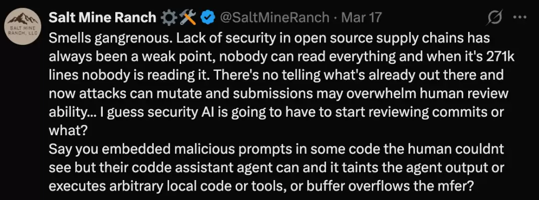 开源供应链的安全问题一直是个老大难,没人能把所有代码都看完,代码量一旦达到数十万行,根本就没人会去通读。而现在,攻击手法还能借助 AI 持续变异,提交量更可能直接将人工审查能力淹没。所以,是不是得让安全 AI 来接管commit审查了?