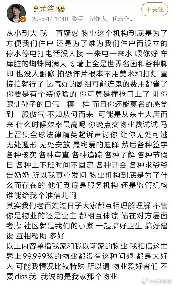 最后李荣浩灵魂发问:“所以我真心发问,物业机构到底是为了什么而存在的?他们到底是服务机构还是监管机构?谁能给我个准信儿啊!” 文末还不忘补一句 “以上单指我家和我以前家的物业,99.999% 的物业都是大好人”,这求生欲直接拉满,被网友调侃 “怕被全国物业拉黑”。