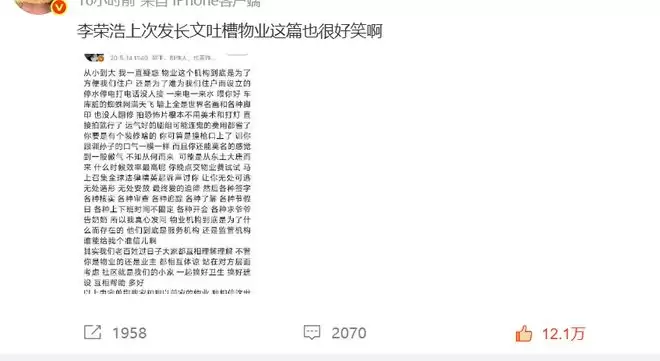 可谁也没料到,网友顺着这场维权大戏考古时,竟把李荣浩 6 年前的一条 “骂物业小作文” 给挖了出来,# 李荣浩骂物业 传世经典# 话题悄咪咪爬上热搜,风头一度盖过正主。