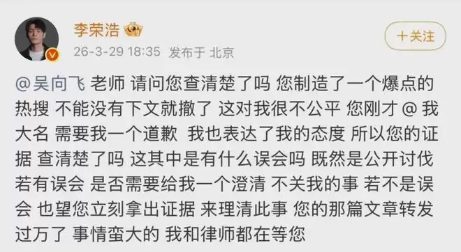 李荣浩见状,晚上六点三十五分再发一条动态,催促他48小时内要么澄清误会,要么拿出证据,还放话“我和律师都在等你”,显见地底气十足。