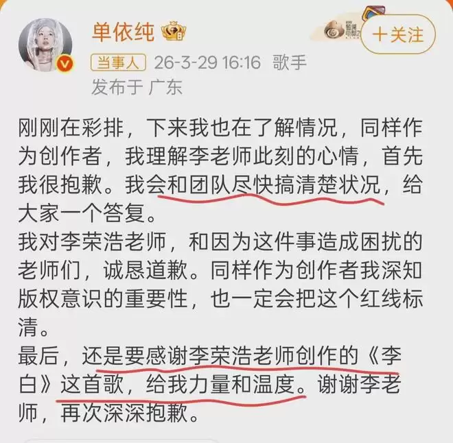单依纯反应倒快,下午四点多就发文道歉,可道歉说得模棱两可,没直接承认侵权,只说要和团队核实情况,还感谢“李荣浩老师创作的《李白》这首歌,给我力量和温度”,被网友吐槽是打感情牌,毫无诚意。