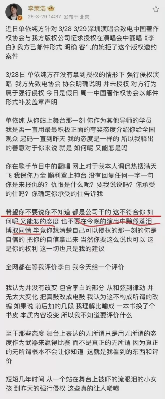 3月29号下午两点多,他火气十足地控诉单依纯,称对方3月28号深圳演唱会上,未经授权就翻唱了自己的经典作品《李白》。