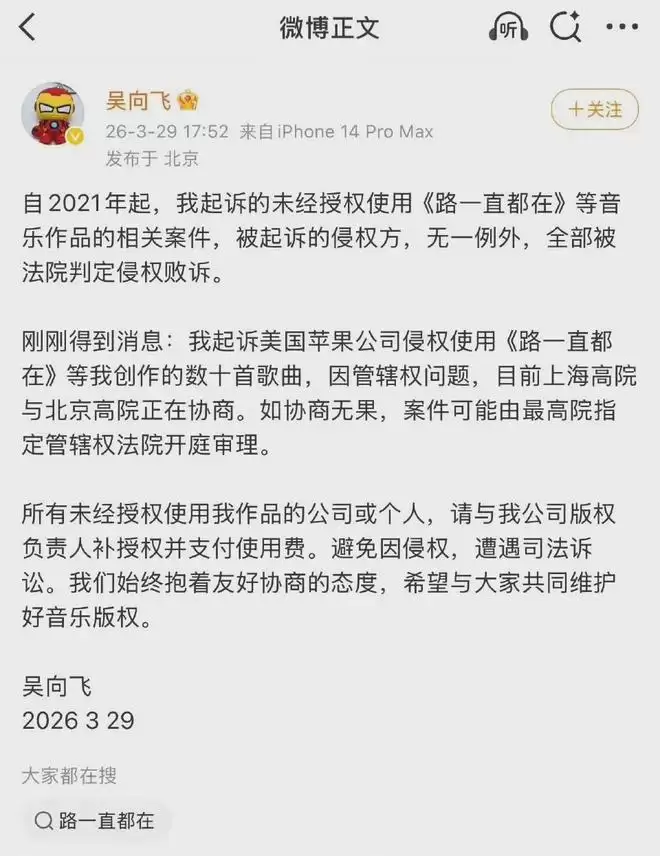 本以为吴向飞会拿出证据正面硬刚,结果他压根不接招。李荣浩回应后,他半句不提演唱侵权的事,反倒发了自己起诉苹果公司版权纠纷的进展,妥妥的避重就轻。