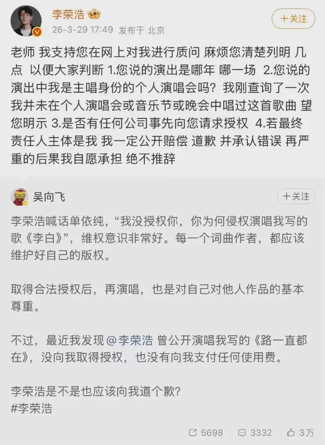 李荣浩汪峰版权风波升级,吴向飞再出手撕合约纠纷
