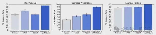在高难度长时程任务中,面对折纸盒、咖啡制备、衣物折叠等包含多阶段操作、精细感知与持续决策的复杂场景,GigaBrain‑0.5M*均实现接近100%的任务成功率,并可稳定复现,充分彰显出卓越的策略鲁棒性。