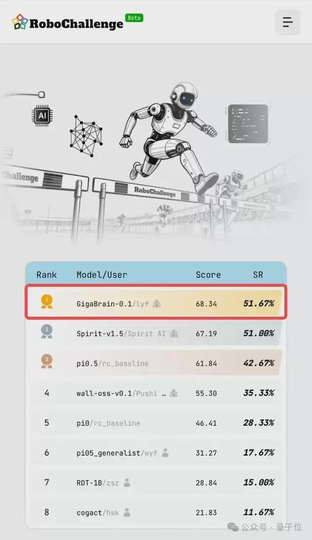 GigaBrain是极佳视界开发的端到端视觉-语言-动作基础模型,在全球目前规模最大的真机评测比赛中,极佳视界的开源模型GigaBrain-0.1超越Pi0.5等众多模型,获得全球第一。
