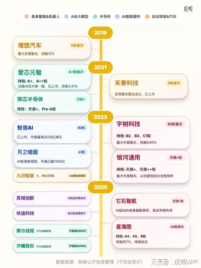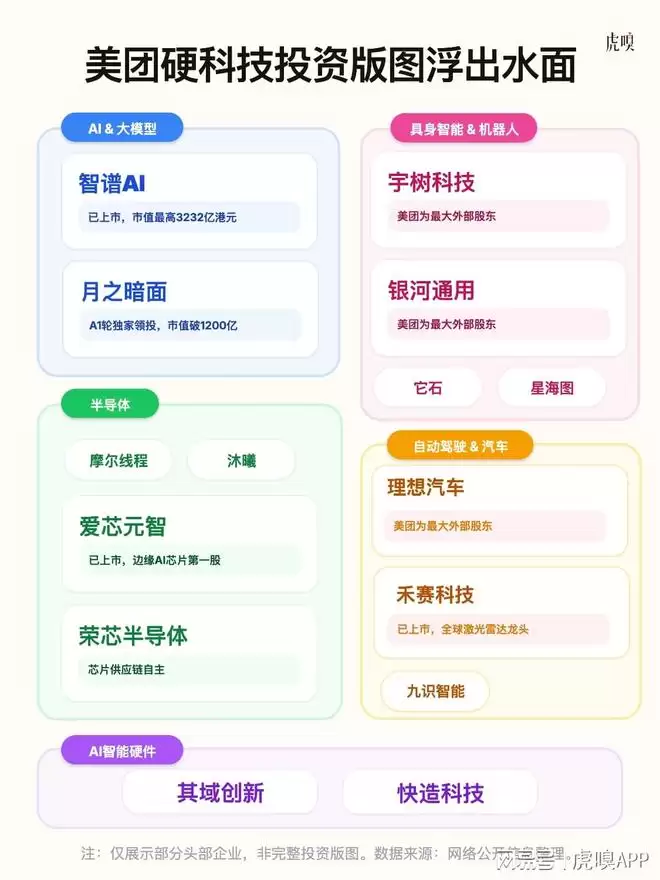 机器人除了宇树,美团还投了银河通用、星海图、自变量等业界公认的头部企业。同时也投了很多AI模型、具身机器人、芯片算力方面的独角兽。大家熟知的智谱AI、月之暗面等大模型公司,芯片算力相关的沐曦股份、摩尔线程、紫光展锐也都投了。