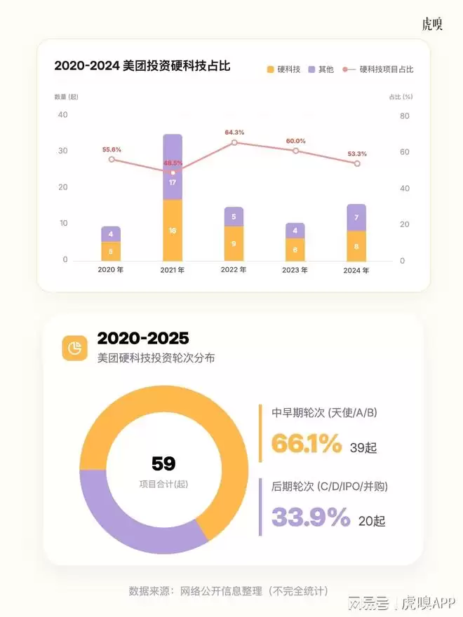 早在2020年,美团就已入场投资硬科技,公司的战略也从“Food+Platform”转向“零售+科技”。之后更是火力全开,每年投资的硬科技项目占比几乎都过半。