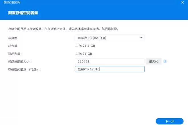以RAID 0模式将4块硬盘建立为单个存储池,总容量为116.6TB,不过在建立存储空间的时候,单个存储空间的容量上限是108TB。