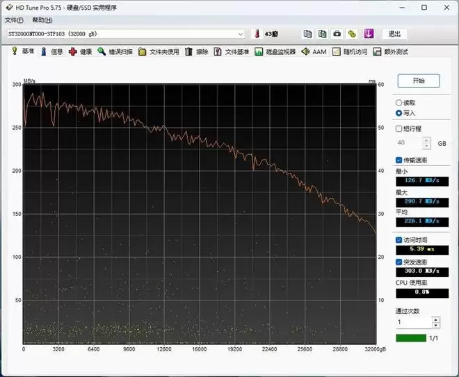 在单盘实测中,希捷酷狼Pro 32TB实测顺序读写速度均超过了290MB/s, HD Tune实测外圈顺序读写速度为292MB/s、中圈顺序读写速度220MB/s、内圈顺序读取速度110~120MB/s。