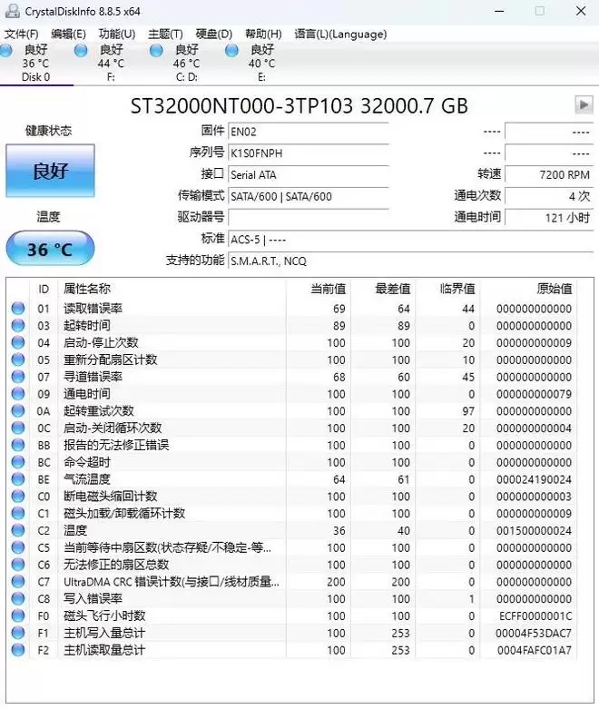 采用CrystalDiskInfo软件查看硬盘信息,可以看到固件版本为EN02,传输模式SATA/600、支持ACS-5、支持S.M.A.R.T、NCQ,转速7200RPM。