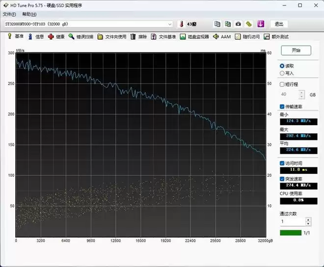 HD Tune基准测试最高读取速度292MB/s,这也是外圈读取速度,而在内圈时,最低读取速度也有124MB/s,访问延迟11.8ms。