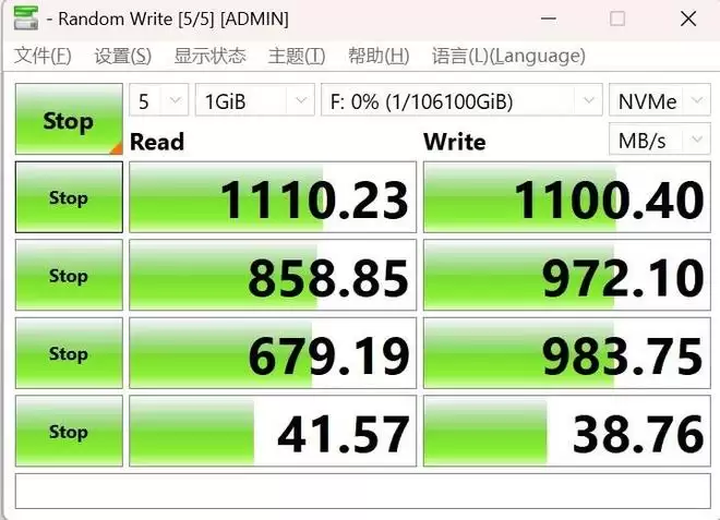 在万兆局域网的加持下,CrystalDiskMark实测顺序读取速度高达1110MB/s、顺序写入1100MB/s,4K随机读取也超过了40MB/s、4K随机写入38MB/s。