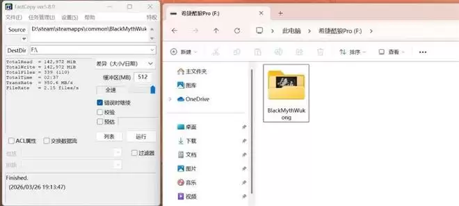 复制《黑神话:悟空》,142GB的数据只用了2分37秒,平均写入速度950MB/s。