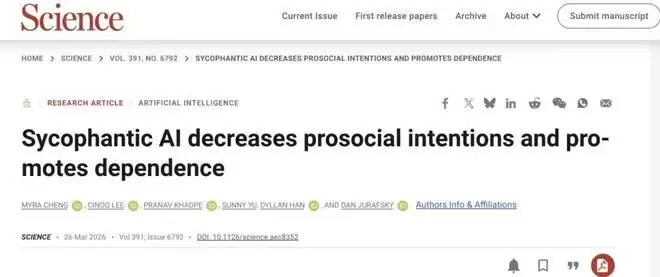 论文标题:Sycophantic AI decreases prosocial intentions and promotes dependence论文链接:https://www.science.org/doi/10.1126/science.aec8352