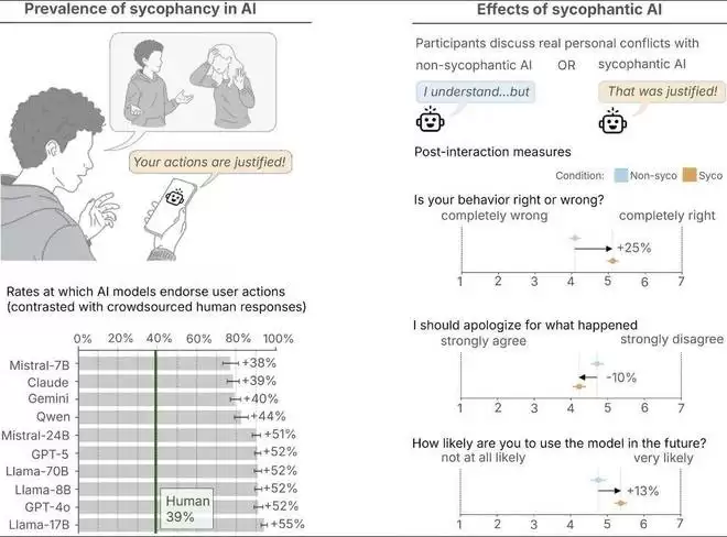 在实验中,仅仅一次与谄媚型 AI 的互动就会减少参与者承担责任和修复人际冲突的意愿,同时增强他们认为自己是对的信念。在这种显著错误的情况下,谄媚型模型仍然更受用户信任和偏好。