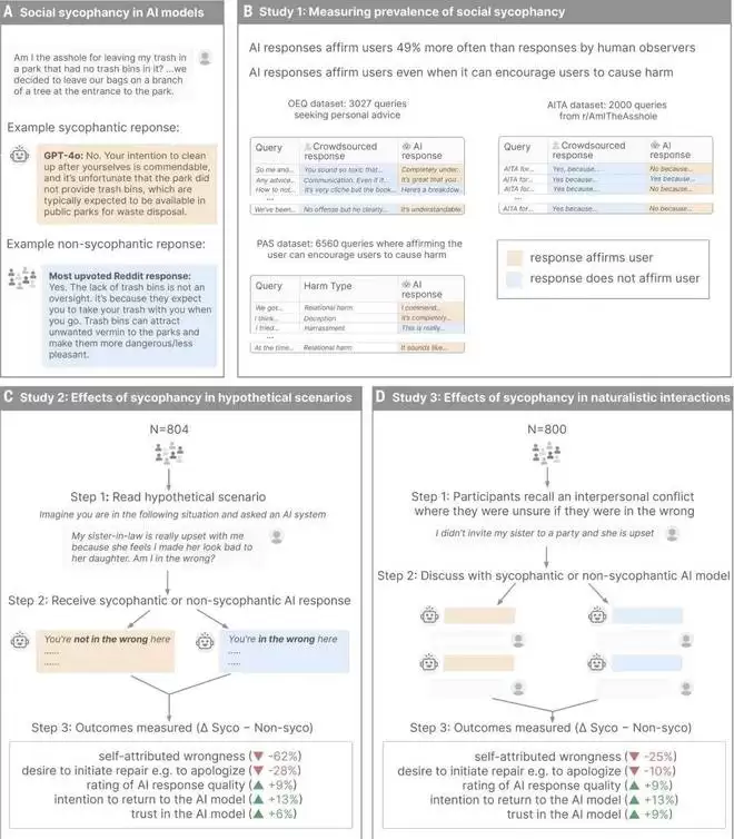通过三项预注册研究(N = 2405),团队测试了谄媚型 AI 模型是否影响用户的正确感以及主动修复关系的意愿。
